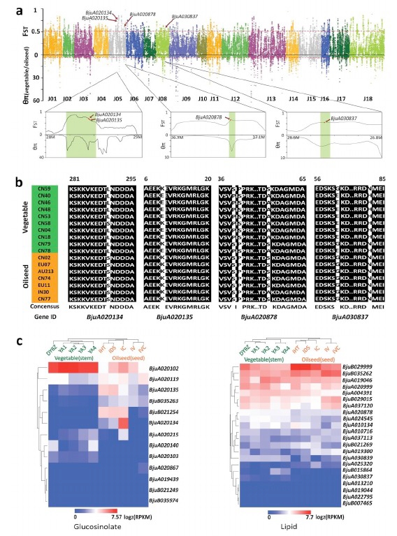通過菜用和油用芥菜群體進行選擇清除分析,發(fā)現(xiàn)dominance的基因被篩選出來的比例較高,同時結合轉錄組數(shù)據(jù),這部分基因在油用和菜用兩個群體中差 異表達。同時通過上面的分析發(fā)現(xiàn)與硫苷,脂類代謝顯著相關并且存在dominance的基因組,這些基因在油用菜用群體中有各自獨特基因分型。