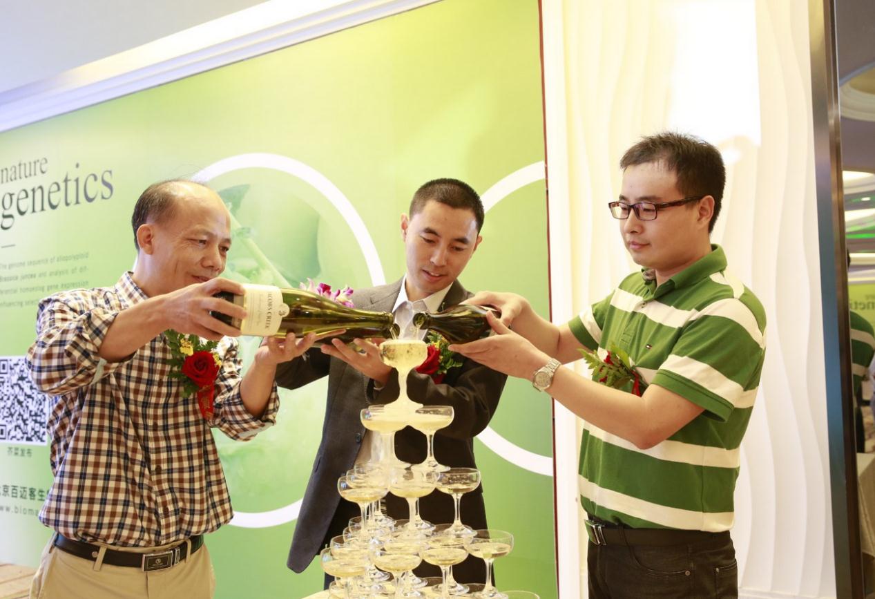 會(huì)中,眾嘉賓同時(shí)為發(fā)布會(huì)揭幕,迎來全場(chǎng)嘉賓們的矚目及掌聲,制作精美的大型雜志模型浮現(xiàn),同時(shí)芥菜基因組數(shù)據(jù)全球同步發(fā)布。接下來中國農(nóng)科院王曉武教 授、百邁客鄭洪坤總裁、浙江大學(xué)楊景華教授一起澆注香檳塔。于軍老師等嘉賓隨后一同舉杯,共同祝賀蕓薹屬科研成果的發(fā)布。會(huì)上有二十幾家媒體到場(chǎng),媒體提 問環(huán)節(jié)也十分引人注目,cctv4、科技日?qǐng)?bào)提出了百姓關(guān)注的餐桌問題;測(cè)序中國、生物探索、生物谷行業(yè)媒體就兩篇論文的基因組發(fā)布技術(shù)和潛在的應(yīng)用前景 與嘉賓進(jìn)行探討,嘉賓們紛紛做了精彩的回答。