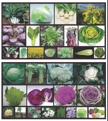 蕓薹屬包括三個二倍體物種:蕓薹(Brassica rapa)、黑芥(B. nigra)和甘藍(B. oleracea),這三個基本種經過兩兩雜交又產生了四倍體的歐洲油菜(B. napus)、非洲油菜(B. carinata)和芥菜(B. juncea),這就是“禹氏三角”。隨著人工馴化和持續(xù)的育種工作,這些物種產生了高度多樣化的形態(tài)型,例如結成球狀的葉片、膨大的塊莖(或根部、頂芽、腋芽等)。有意思的是,某些物種的形態(tài)型,盡管是在不同的地區(qū)獨立培育而成,但卻表現出相似的表型特征,這便是趨同馴化的結果。