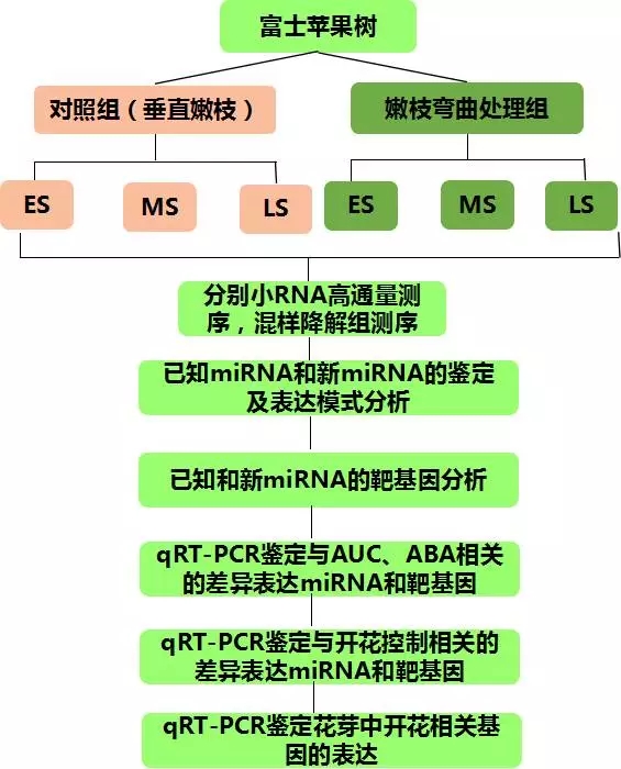 生長六年大小的富士蘋果樹,分兩組進行嫩枝彎曲(110度)、對照處理(垂直嫩枝),分別在開花誘導(dǎo)的初期(early stage,ES)、中期(Middle stage,MS)和晚期(Later stage,LS)取花芽,分別提取RNA進行小RNA測序,6個花芽組織RNA混樣進行降解組測序。