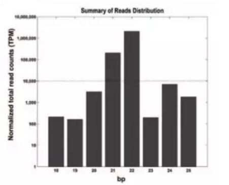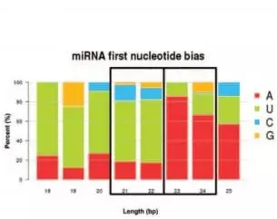 miRDeep2軟件鑒定175個(gè)潛在的miRNA。長(zhǎng)度分布分析顯示21和22bp的miRNA豐度*高;對(duì)成熟miRNA的堿基偏好性分析:21和22bp的miRNA首位堿基偏好于“U”;23和24bp的miRNA首位堿基偏好于“A”。