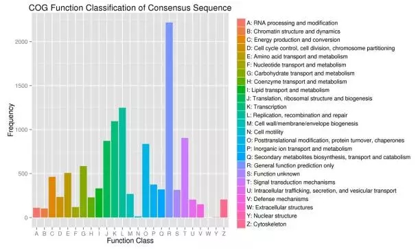 2.用BLASTX將組裝得到的序列與Nr,Swiss-Prot,GO,COG和KEGG數(shù)據(jù)庫進(jìn)行比對,共有8288個(gè)Unigenes注釋到了25個(gè)COG類別中的11713個(gè)功能。有585個(gè)Unigenes注釋到“碳水化合物的運(yùn)輸和代謝”。