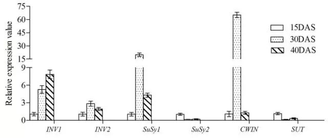 5.使用qRT-PCR驗(yàn)證參與蔗糖代謝的差異表達(dá)基因。這6個(gè)差異表達(dá)基因的表達(dá)水平與RNA-seq結(jié)果是一致的。
