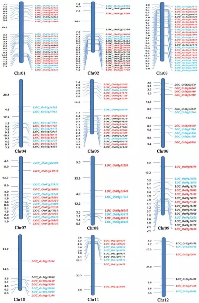 圖3:與育性和雜種優(yōu)勢(shì)相關(guān)的基因在染色體上分布。紅色為葉片中的基因,藍(lán)色為花藥中的基因,黑色為子房中的基因。