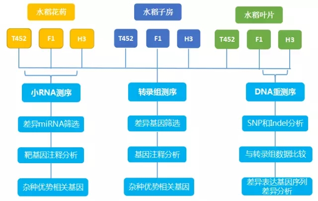 小RNA測(cè)序:取T452,H3及雜交F1代的減數(shù)分裂階段的花藥進(jìn)行小RNA測(cè)序,無(wú)生物學(xué)重復(fù)。