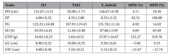 表一:T452與H3雜交F1代的雜種優(yōu)勢(shì)。HPH:高親優(yōu)勢(shì);MPH中親優(yōu)勢(shì);PH:植株高度;EP:?jiǎn)沃旯攘?shù);FG:?jiǎn)位ü攘?shù);SS:結(jié)實(shí)率;GYP:?jiǎn)沃戤a(chǎn)量;GL:10谷粒長(zhǎng)度;GW:10谷粒寬度。