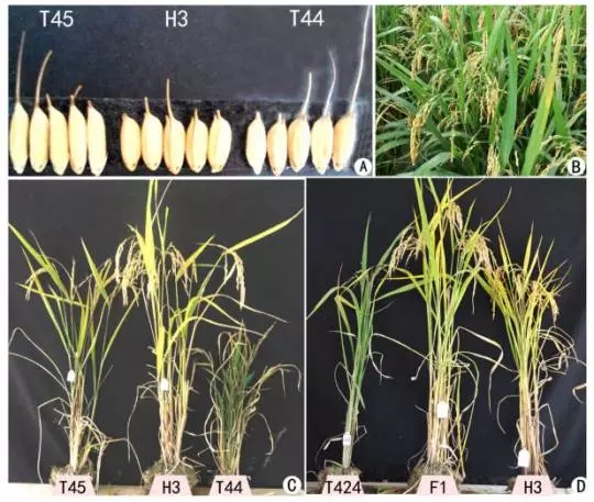 圖1:親本和雜交F1代的表型。(A)Jackson-4x(T45),Huaduo 3(H3)與96025(T44)的谷粒大小,H3是來(lái)自T45和T44的雜交;(B)H3在大田中的長(zhǎng)勢(shì);(C)T45,H3,T44的植物表型;(D)Shennong15-4x(T424),H3,以及兩者雜交F1代的表型。