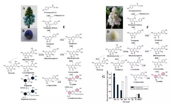 葡萄風(fēng)信子(Muscari)是一種重要的觀賞性球根植物,具有獨(dú)特藍(lán)色、花形和甜香。天然突變種白色風(fēng)信子為探究某些潛在生化特征,特別是顏色相關(guān)的復(fù)雜代謝網(wǎng)絡(luò)研究提供了機(jī)會(huì)。據(jù)報(bào)道,花青素是風(fēng)信子花色的主要色素。藍(lán)色花主要由飛燕草色素(Del)決定,紅色花由花青色素(Cy)決定?;ㄇ嗨厥侵参锟茖W(xué)中研究最多和最了解的化合物之一,然而,在不同植物中調(diào)控花青素分解代謝的分子機(jī)制還遠(yuǎn)遠(yuǎn)沒(méi)有定論。