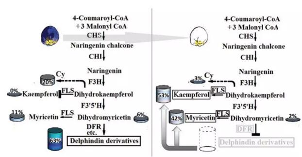 在藍(lán)色風(fēng)信子中檢測(cè)到與Del合成相關(guān)的部分同源序列的表達(dá)上調(diào),在某些情況下,高出> 1000倍。結(jié)合HPLC分析結(jié)果,DFR可能是白色葡萄風(fēng)信子中藍(lán)色色素沉積(Del)消失的靶基因。另外,F(xiàn)LS和DFR在共同的二氫楊梅素底物之間的強(qiáng)烈競(jìng)爭(zhēng),可能部分地阻斷Del的合成并引起其他類黃酮化合物,如楊梅素的產(chǎn)生,由此進(jìn)一步消除白色風(fēng)信子中藍(lán)色色素沉積。