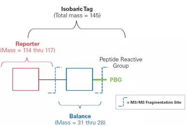 iTRAQ試劑由三部分組成:報(bào)告基團(tuán);質(zhì)量平衡基團(tuán)和肽反應(yīng)標(biāo)記試劑基團(tuán),可形成4種或8種相對(duì)分子質(zhì)量均為145的等量異位標(biāo)簽。