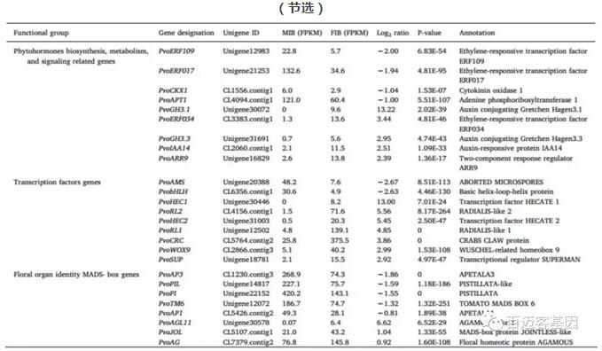 在很多植物中,激素對(duì)于花性別分化起著重要作用,本項(xiàng)目中也發(fā)現(xiàn)了一系列與植物激素相關(guān)的DEG。比如,乙烯信號(hào)途徑中編碼PvoERF109和PvoERF017的基因在FIB中分別下調(diào)3倍和2.8倍;細(xì)胞分裂素途徑中編碼PvoCKX1和PvoAPT1的基因下調(diào)1倍左右;生長(zhǎng)素途徑中編碼PvoGH3.3和PvoIAA14的基因分別上調(diào)6.7和4.7倍。這說(shuō)明在南美油藤中,植物激素也參與了花性別分化。