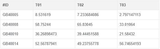 默認首行、首列為表頭,一般每列表示一個樣品,每行表示一個基因,也可統(tǒng)計其他含義的數(shù)據(jù)矩陣。除表頭外,參與統(tǒng)計繪圖的內(nèi)容應為純數(shù)字,文件范例如下: