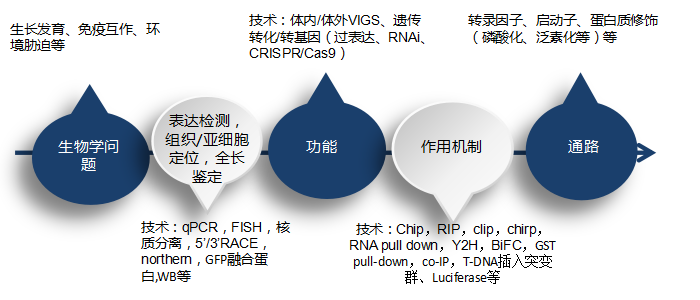 基因或ncRNA研究組成模塊本質(zhì)上是差不多的,都是由生物學(xué)問(wèn)題、分子(基因或ncRNA)、功能和機(jī)制、通路組成,而每個(gè)層面又有針對(duì)于不同情況的具體的實(shí)驗(yàn)技術(shù),而文章的千變?nèi)f化就在于這些模塊之間、這些技術(shù)之間的不同組合。