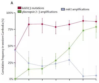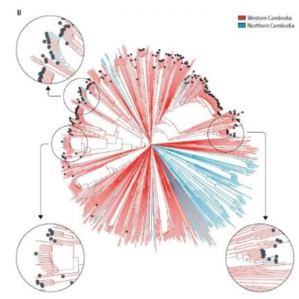 研究人員通過對來自于東南亞的1492例惡性瘧原蟲樣本的基因組序列數(shù)據(jù)分析,其中包括2007至2013年間在柬埔寨西部收集的464個惡性瘧原蟲樣本,耐藥性的不同流行病學(xué)起源通過對Kelch13青蒿素耐藥基因座和plasmepsin 2-3 哌喹耐藥基因座的單倍型分析進(jìn)行鑒別。最終確定了30多個獨立的青蒿素耐藥性起源,其中91%為KEL1譜系(140/154)為耐受雙氫青蒿素哌喹抗性的寄生蟲。2008年,KEL1譜系和與哌喹抗性相關(guān)PLA1譜系相結(jié)合。2013年,KEL1/PLA1 結(jié)合譜系在柬埔寨西部頻率達(dá)到63%(24/38),并已蔓延至柬埔寨北部。