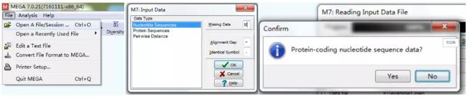 File — Open A File/Session — 選擇要導入的文件,選擇數(shù)據(jù)類型(如果是SNP即為Nuceotide Sequences),提示Protein-coding nucleotide sequence data時,選擇No,即不把DNA序列翻譯成蛋白序列構建進化樹,如圖5。