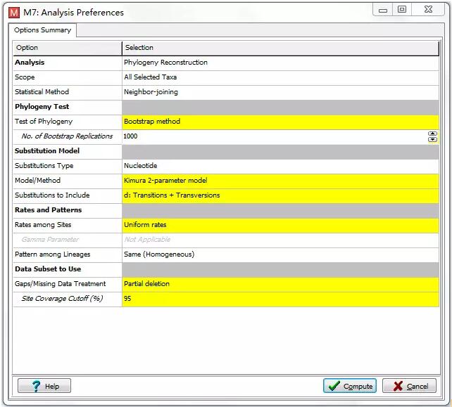 參數(shù)設置,主要填寫B(tài)ootstrap值,一般選擇500或1000次;Model一般用Kimura 2-parameter Model(K2),如果K2模型運行不了,可以換成p-distance模型;Gaps/Missing Data Treatment選擇Partial deletion或者pairwise deletion,選擇complete deletion時帶有缺失值的標記都會被刪除,所以必須謹慎;Site Coverage Cutoff與我們常說的完整度相同,一般填寫成我們過濾標記時使用的完整度,上述參數(shù)設置完成后,點擊compute即可。(見圖6)