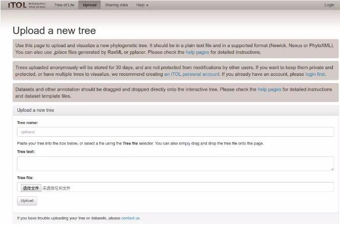1、打開iTOL主頁以后,選擇上端的Upload選項,出現(xiàn)輸入界面后,可以在Tree text框中粘貼nwk中的內容,也可以通過【選擇文件】選項選擇需要展示的進化樹,之后點擊Upload即可。