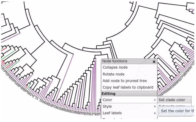 4、分枝顏色的統(tǒng)一。上面的著色例子只對末端分枝進行了著色,有時候,我們需要對某個分枝的樣本進行顏色的統(tǒng)一,可以選中該分枝并點擊鼠標,在彈出的下拉框中選擇color — set clade color — 選擇想用的顏色或填入對應的顏色代碼即可。