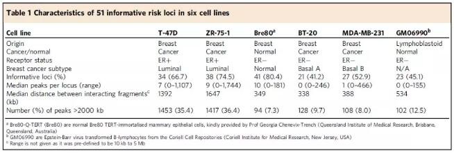 在2種ER +乳腺癌細胞系(T-47D,ZR-75-1)、2種ER-乳腺癌細胞系(BT-20,MDAMB-231)、1種“正?!比橄偕掀ぜ毎?(Bre80-Q-TERT/Bre80)和1種非乳腺類淋巴母細胞系(GM06990)中進行了CHi-C測序。風險基因座定義為包含至少1個風險SNP位點在內(nèi),且包含與該SNP相關(guān)(r2>0.2)的所有SNP的一個連續(xù)區(qū)域。每個細胞系的互作peak數(shù)目在0-1744的范圍內(nèi),有12個基因座沒有在以上任何一種細胞系中鑒定到互作peak。剩余的51個loci中46個是與所有乳腺癌或者ER+乳腺癌風險相關(guān)的。
