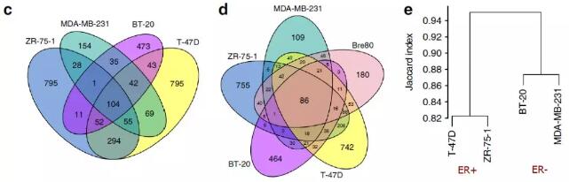 作者發(fā)現(xiàn)ER+乳腺癌細胞系中互作peak數(shù)目顯著高于ER-乳腺癌細胞系,且ER+乳腺癌細胞系中存在很大一部分距離大于2Mb的互作片段。分析樣本間互作peak的Jaccard相似性,發(fā)現(xiàn)ER+和ER-各自組內(nèi)具有更高的相似性。