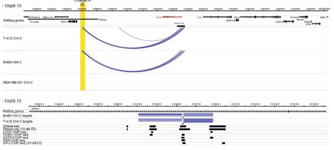 互作peak示例:下圖為10q26.13基因座的互作peak(loop),在ER+乳腺癌細胞系和正常乳腺上皮細胞系中鑒定到了互作peak,但是ER-乳腺癌細胞系中則未檢測到。互作靶基因的轉(zhuǎn)錄起始位點(TSS)位于捕獲區(qū)域內(nèi),并且和相距幾百Kb遠的特異的HindIII酶切片段形成環(huán)(互作Peak)。在T-47D細胞系中,這些遠距離片段與DNase I超敏位點、CTCF、FOXA1、GATA3轉(zhuǎn)錄因子結(jié)合位點以及雌激素受體ERα結(jié)合位點共定位。
