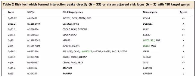 作者將靶基因定義為至少兩個細胞系中,定位到捕獲區(qū)域內(nèi)或捕獲區(qū)域的順式作用區(qū)間(≤5 Mb)的基因,且其轉(zhuǎn)錄起始位點/TSS定位在相互作用片段上。以此為準能夠為51個基因座中的33個(64.7%)鑒定到110個推定的靶基因,其中94個為蛋白編碼基因,16個非編碼RNA。作者比較了GWAS風險SNP位點的臨近基因以及本研究中鑒定到的靶基因,發(fā)現(xiàn)其中24個基因座的鄰近基因是唯一的CHi-C靶基因(N = 9)或幾個CHi-C靶基因之一(N = 15)。