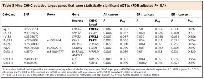 為了評估推定的靶基因在乳腺癌病因中具有因果作用的可能性,作者首先使用風險SNP(或與風險SNP連鎖不平衡的位點,r2> 0.8)和TCGA數(shù)據(jù)庫中的RNA-Seq數(shù)據(jù)(N=547)進行eQTL分析( TCGA),并對匹配的DNA甲基化數(shù)據(jù)和體細胞拷貝數(shù)變異進行了校正,根據(jù)ER狀態(tài)進行分層分析。共計鑒定到了22個顯著SNP-基因組合(t檢驗p<0.05),其中9個經(jīng)過多重檢驗FDR校正后仍然顯著。其中,3個基因為鄰近基因。