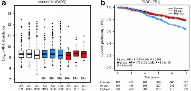 作者所納入的風險SNP在此之前只有一個位點(16q12.1-rs3803662)報道了與疾病預(yù)后相關(guān)。本研究中作者直接分析了代謝型乳腺癌隊列中潛在的靶基因的表達水平與的患者預(yù)后之間的關(guān)聯(lián)(分別對ER +和ER-亞組進行生存分析)。其中32個靶基因(33%)與ER +乳腺癌患者的DSS相關(guān),6個DSS相關(guān)的靶基因為eQTL靶基因。