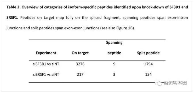 肽段數(shù)量上的差別直接和兩個實驗剪接isoform數(shù)據(jù)庫的數(shù)目相關(guān)??偟膩碚f,大約60%的isoform特異肽段會比對到目標區(qū)域,跨越exon-econ junction的split 肽段約占40%,跨越 exon-intron junctions 的spanning肽段則很少被發(fā)現(xiàn)(如表2所示)。