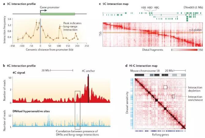 基于3C及衍生技術(shù),克服了成像技術(shù)的缺點,能夠以足夠的分辨率在全基因組范圍內(nèi)研究染色體折疊,以及涉及的基因和調(diào)控元件。詳細介紹見上述實驗技術(shù)——染色質(zhì)構(gòu)象捕獲及其衍生技術(shù)。