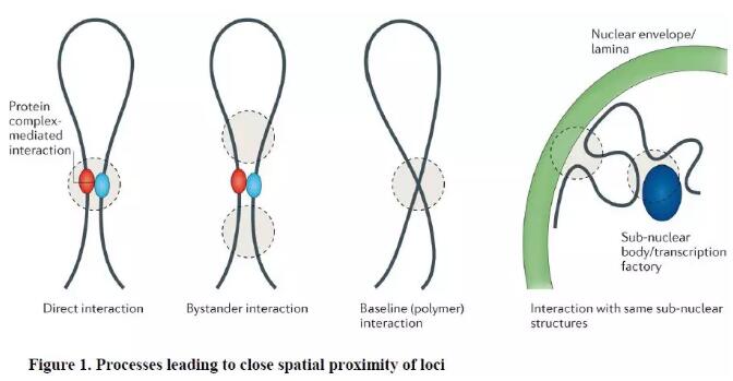 這些3C及其衍生技術(shù)報告了細胞群體中兩個基因座空間上緊密接近的頻率,但未區(qū)分功能性與非功能性的位點間關(guān)聯(lián),也未揭示導致其共定位的機制??臻g上緊密接近包括以下幾種情況:1)Direct interaction:兩個基因座之間直接、特異性接觸的結(jié)果(由結(jié)合它們的蛋白質(zhì)復合物介導);2)Interaction with the same sub-nuclear structures:成對基因座與相同亞核結(jié)構(gòu)間接共定位的結(jié)果(例如核纖層,核仁、或轉(zhuǎn)錄工廠等)。3)Bystander interaction:在某些細胞中,由于鄰近的某些遠程互作或其他約束因素決定的染色質(zhì)纖維的堆積和折疊的造成的非特異性接觸,或者由于擁擠核中的隨機(非特異性)碰撞導致的非特異性接觸。4)Baseline(polymer) interaction:染色質(zhì)纖維非常長,而且柔韌,染色體具有聚合體性質(zhì),因此,即使在沒有任何特定高階結(jié)構(gòu)的情況下,這個特征在很大程度上也決定了基因座間相互作用的頻率。