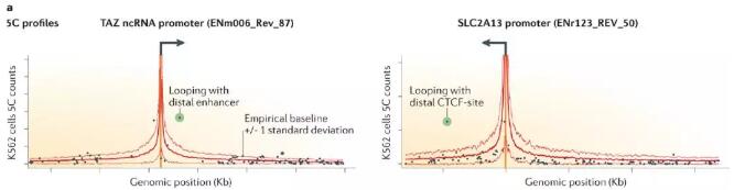 盡管5C技術(shù)存在上述缺陷,但仍舊揭示了染色質(zhì)不同區(qū)域間遠程互作參與基因表達調(diào)控的普遍規(guī)律。Sanyal等人發(fā)現(xiàn)了基因啟動子和遠端基因座之間有數(shù)千個重要的遠距離loop互作,強調(diào)了許多基因啟動子通過染色質(zhì)環(huán)與遠端元件互作的觀點。普遍規(guī)律如下:1)許多染色質(zhì)成環(huán)事件是活性基因啟動子和類似于活性增強子的遠端元件之間的細胞類型特異性互作,這與這些染色體結(jié)構(gòu)在基因活化中的作用一致;2)其中一類豐富的遠程互作即是啟動子區(qū)與絕緣蛋白CTCF結(jié)合位點之間成環(huán);3)通常認為調(diào)控元件可以調(diào)節(jié)*鄰近的基因,但是成環(huán)互作經(jīng)常跳過一個或多個基因,這表明基因和元件的線性排列是它們之間功能和結(jié)構(gòu)互作的較差預測因子;4)基因和調(diào)控元件之間的關(guān)系并不唯一:一個基因可以與多個遠端元件互作,同時一個元件也可以與多個基因互作。