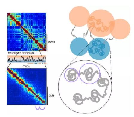 哺乳動物基因組的染色體內(nèi)和染色體間相互作用圖揭示了一種相互作用模式,可以近似分為兩個隔間(A和B,或稱區(qū)室/隔室),它們沿著染色體交替,并且具有約5Mb的特征尺寸。A隔間優(yōu)先與整個基因組中的其它A隔間相互作用。 同樣,B隔間與其它B隔間相關(guān)聯(lián)。隔間信號可以通過互作圖的特征向量擴展來量化。 A / B室信號不是簡單的雙相(僅代表兩種狀態(tài)),而是連續(xù)的,并且與轉(zhuǎn)錄活性指標,如DNA可及性、基因密度、復制時間、GC含量和幾個組蛋白標記相關(guān)。A-隔間主要是常染色質(zhì)-轉(zhuǎn)錄活躍區(qū)域,B-隔間則主要是聚集在一起的異染色質(zhì)(轉(zhuǎn)錄失活區(qū)域)。
