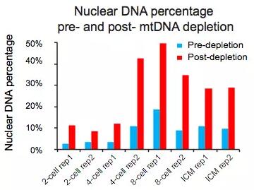 ATAC測(cè)序和轉(zhuǎn)錄組一樣,也是有時(shí)空特異性,但是由于ATAC測(cè)序建庫(kù)的時(shí)候需要對(duì)細(xì)胞進(jìn)行裂解提取細(xì)胞核,再通過(guò)轉(zhuǎn)座酶對(duì)細(xì)胞核中正在轉(zhuǎn)錄組的染色體序列進(jìn)行酶切,那么我們對(duì)實(shí)驗(yàn)處理中的細(xì)胞活性就有一定的要求—不能用凍存后的細(xì)胞來(lái)建庫(kù);另外,由于轉(zhuǎn)座酶對(duì)DNA序列進(jìn)行酶切的時(shí)候,只要是轉(zhuǎn)座酶可以接近的區(qū)域都可以進(jìn)行酶切,這就造成了測(cè)序數(shù)據(jù)中有好大一部分是線粒體的DNA序列,這些DNA我們認(rèn)為是污染的部分,會(huì)盡量用探針進(jìn)行除去,但是探針去除的效率也有限。如在小鼠胚胎不同發(fā)育時(shí)期的ATAC測(cè)序?qū)嶒?yàn)中,作者對(duì)探針去除線粒體DNA的效率進(jìn)行了鑒定[2],所測(cè)結(jié)果如圖1,可見(jiàn)核DNA最多的時(shí)候占比也僅僅有50%,那么相比較而言線粒體DNA的去除也就相當(dāng)重要了;而植物細(xì)胞,由于其細(xì)胞壁結(jié)構(gòu)不能直接通過(guò)酶對(duì)細(xì)胞進(jìn)行裂解,并且測(cè)序結(jié)果中有好大一部分是葉綠體DNA污染,因此在做植物的ATAC測(cè)序時(shí),則需要將植物細(xì)胞制備成原生質(zhì)體,并且用梯度離心法來(lái)收集細(xì)胞核后再進(jìn)行建庫(kù)[5]。不管是線粒體DNA還是葉綠體DNA的污染,都可以在建庫(kù)之后進(jìn)行少量數(shù)據(jù)測(cè)序,通過(guò)簡(jiǎn)單的比對(duì)分析,來(lái)大概估測(cè)文庫(kù)中的污染占比,從而決定是否正式進(jìn)行測(cè)序。