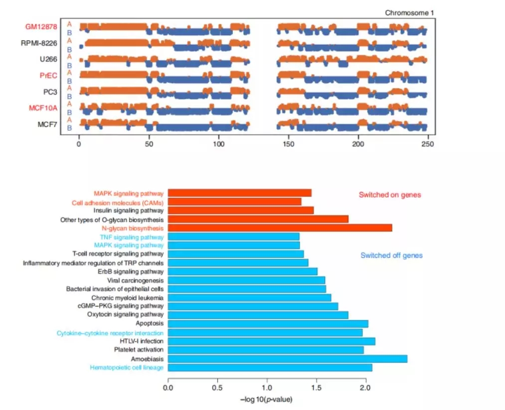例如在人的多發(fā)性骨髓瘤文章中,作者利用正常B細胞(GM12878)和兩種亞型的骨髓瘤細胞(近二倍體U266和近三倍體RPMI-8226)進行Hi-C、WGS和RNA-seq測序,結(jié)果發(fā)現(xiàn),相比于GM12878,U266和RPMI-8226癌癥細胞中6%的區(qū)域均存在B轉(zhuǎn)換到A,1%的區(qū)域均存在A轉(zhuǎn)換到B,結(jié)合RNA-seq數(shù)據(jù),發(fā)現(xiàn)B轉(zhuǎn)換到A區(qū)域內(nèi)的基因變成轉(zhuǎn)錄活躍狀態(tài),而A轉(zhuǎn)換到B區(qū)域內(nèi)的基因變成轉(zhuǎn)錄抑制狀態(tài),KEGG富集通路發(fā)現(xiàn)這些基因與多發(fā)性骨髓瘤相關(guān),主要涉及MAPK信號轉(zhuǎn)導途徑、TNF信號轉(zhuǎn)導途徑、細胞因子和細胞因子受體相互作用途徑等,進一步在染色體2q11.2-q12.142處發(fā)現(xiàn)一個細胞因子基因簇,幾種白細胞介素IL1R1,IL1R2,IL18R1和細胞因子MAP4K4下調(diào)表達,這些基因在后續(xù)研究中重點關(guān)注。