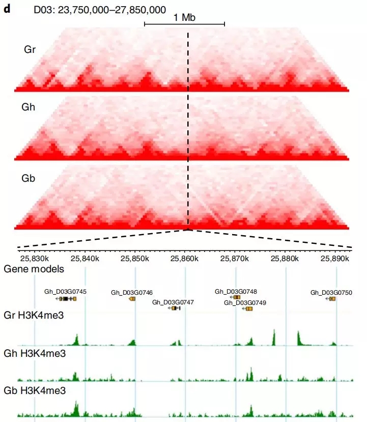 例如,在棉花的三維基因組進化文章中,作者對二倍體雷蒙德氏棉、二倍體亞洲棉、四倍體陸地棉和四倍體海島棉構(gòu)建了三維基因組圖譜,與雷蒙德氏棉D(zhuǎn)03染色體相比,陸地棉和海島棉對應的D亞基因組中發(fā)生了染色質(zhì)重排,虛線對應的TAD結(jié)構(gòu)發(fā)生了變化,雷蒙德氏棉中該TAD結(jié)構(gòu)完整,存在明顯的邊界,陸地棉中該邊界發(fā)生了左移,而海島棉中該TAD趨向于消失。因而通過鑒定TAD發(fā)生變化區(qū)域的基因,可以研究多倍化過程中基因表達調(diào)控的改變(研究多倍體的老師們,這可是一個很好的套路文章哦)。同時結(jié)合ChIP-seq數(shù)據(jù)對該TAD邊界進行分析發(fā)現(xiàn),雷蒙德氏棉富含豐富的H3K4me3(活性染色質(zhì)標記),而陸地棉和海島棉中H3K4me3顯著減少,說明在棉花的多倍化與表觀遺傳修飾存在密切關(guān)聯(lián)。
