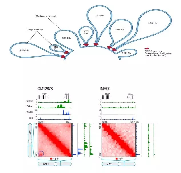 例如,在人的loop文章中,作者在GM12878細胞系發(fā)現(xiàn)9448個loop,其中2854個loop與已知的啟動子-增強子作用相關(guān),基因的啟動子存在loop比不存在loop時的表達量顯著增加。GM12878細胞系中存在一個Loop,這個Loop連接了SELL啟動子和一個遠端增強子SELP,基因開啟轉(zhuǎn)錄,表達量增加,而IMR90細胞系中沒有這個Loop,基因不表達。