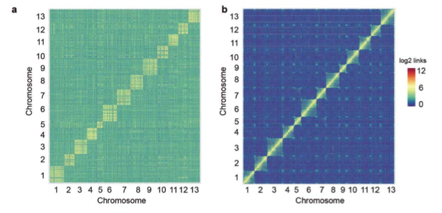 a. Hi-C數(shù)據(jù)與亞洲棉原基因組比對;b. Hi-C數(shù)據(jù)與亞洲棉更新基因組比對