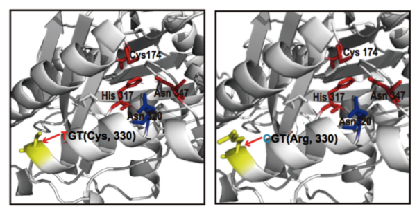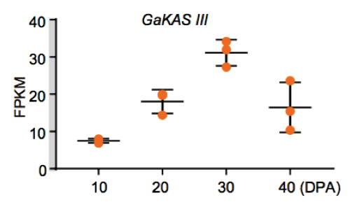 (1)脂肪酸含量相關(guān)基因的定位與研究 棉花是世界上第六大植物油來源,通過GWAS關(guān)聯(lián)分析,在11號染色體上的GaKASIII基因組座位上(Ga11G3851)的第8個外顯子區(qū)獲得了1個顯著的SNP位點,該基因編碼3-Oxoacyl-[acyl-carrier-protein ACP] synthase III(3-氧?;?[酰載體蛋白]合酶III),如圖8 a-c,KASIII基因編碼的這一關(guān)鍵酶可以使得脂肪酸鏈從C2到C4延伸,并最終確定種子中棕櫚酸(C16:0)和棕櫚油酸(C16:1)的組成。GaKASIII基因的多態(tài)性導(dǎo)致了保守的ACP_synthase_III_(酰載體蛋白合酶III)結(jié)構(gòu)域中半胱氨酸/精氨酸間的置換(圖8 c),單倍型B(TGT,Cys)主要出現(xiàn)在低含油量種質(zhì)中,而在高含油量種質(zhì)中發(fā)現(xiàn)單倍型A(CGT,Arg)(圖8 d-e)。GaKASIII基因在開花后(DPA)的30天表達量最高(圖9),這是種子油量積累的關(guān)鍵階段,在單倍型種質(zhì)A中,C16:0和C16:1含量以顯著的速率累積(圖10);蛋白質(zhì)結(jié)構(gòu)模型預(yù)測顯示,半胱氨酸/精氨酸殘基位于α螺旋處,該位點靠近酶活性位點,同時是輔酶A(CoA)結(jié)合位點(圖11)。