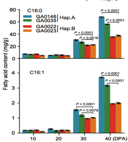 圖10 在棉花生長發(fā)育過程中C16:0和C16:1脂肪酸含量分析(Hap. A和Hap. B)