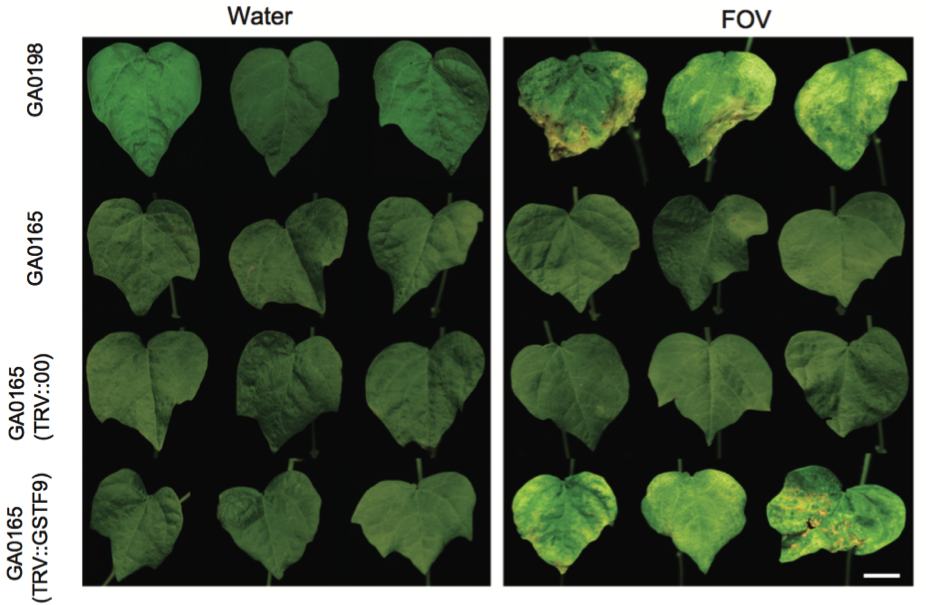 圖14 不同植株處理后的病癥比較(GA00198,GA0165,TRV::00和TRV::GSTF9,