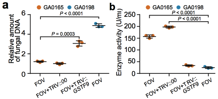 圖16 a GA00198, GA0165, TRV::00和TRV:GSTF9植株中FOV DNA的相對含量測定;b GA00198, GA0165, TRV::00和TRV:GSTF9植株中GST酶活性測定;