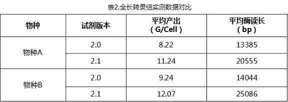 ? ? ? 本次2.1版本試劑的發(fā)布,在全長轉(zhuǎn)錄上的實(shí)測亦有優(yōu)異的表現(xiàn)。通過實(shí)測發(fā)現(xiàn),2.1版本試劑數(shù)據(jù)產(chǎn)出較升級前的8-9G/Cell提升到了11-12G/Cell的平均水平。同時(shí),平均酶讀長也達(dá)到了20K以上。酶讀長的有效增加,有利于拿到更多的高質(zhì)量全長轉(zhuǎn)錄數(shù)據(jù),從而有效提高全長轉(zhuǎn)錄組的分析質(zhì)量。