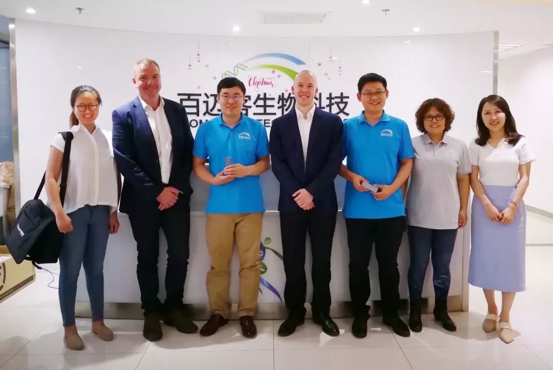 百邁客與Oxford Nanopore 商業(yè)運(yùn)營(yíng)副總裁Richard ,中國(guó)區(qū)商務(wù)負(fù)責(zé)人Thomas及技術(shù)支持Lin與Eva一行合影