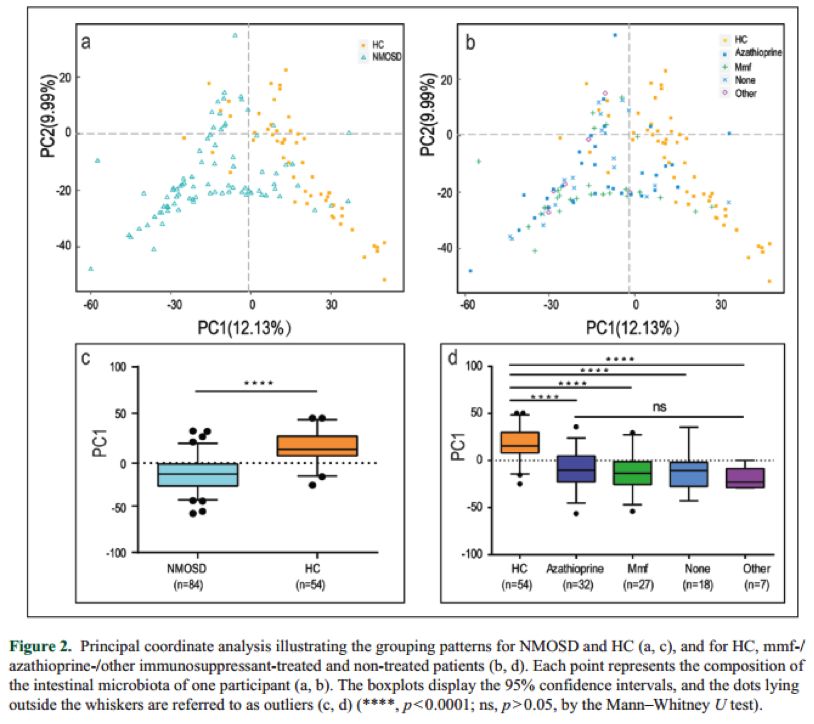 樣品來源:84名中國(guó)NMOSD患者(AQP4-IgG血清反應(yīng)呈陽性),54名健康人群(HCs);84名NMOSD患者中,66名使用免疫抑制劑(27名使用霉酚酸酯mmf,32名使用硫銼嘌呤azathioprine,7名服用環(huán)流酰胺、甲氨蝶呤或利妥昔單抗),18名NMOSD患者不做治療。