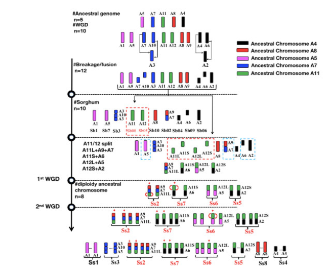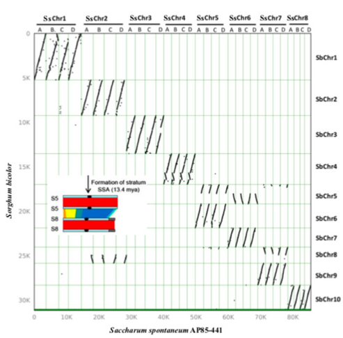AP85-441基因組的組裝顯示了S.spontaneum的染色體數(shù)目從10降到8,而這與頻繁復(fù)制的古復(fù)制染色體對(duì)相關(guān),通過(guò)與高粱的聚類比對(duì),發(fā)現(xiàn)高粱祖先5染色體和8號(hào)染色體同源物經(jīng)歷了染色體裂變(圖2)。SbChr05(A12)的祖先染色體斷裂分為兩個(gè)主要部分,即C5S(A12S)和C5L(A12L),分別轉(zhuǎn)移到SbChr06(A2)和SbChr07(A5)的祖先染色體;SbChr8(A11)的祖先染色體斷裂為兩個(gè)主要的部分,即C8S(A11S)和C8L(A11L),分別轉(zhuǎn)移到SbChr09(A6)和SbChr02(A7+ A9)的祖先染色體中。SbChr8和SsChr5之間及SbChr5和SsChr7之間近乎同源的短片段是在高粱與甘蔗分化前,高粱SSA形成于13.4MYA同源基因的殘留物,同時(shí)發(fā)現(xiàn),S5中較小的SSA區(qū)域和S8中SSA的較大區(qū)域在重排的AP85-441基因組中也是保守的。