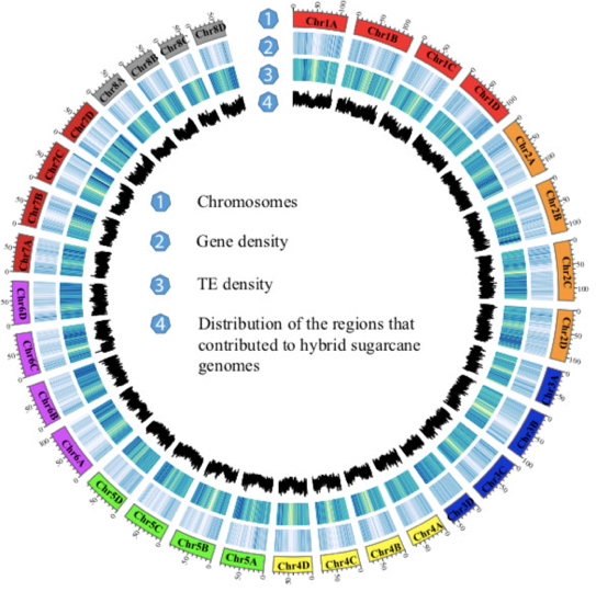 利用BAC文庫(kù)進(jìn)行二代測(cè)序,ALLPATH-LG,SPAdes 和SOAPdenovo2進(jìn)行初步組裝,進(jìn)一步利用87X 三代PacBio數(shù)據(jù)進(jìn)行糾錯(cuò),CANU進(jìn)行組裝,組裝基因組3.13G,contigN50=45 kb(流式評(píng)估基因組大小:3.36G);通過(guò)Hi-C染色體掛載技術(shù),針對(duì)多倍體染色掛載新算法ALLHIC,進(jìn)一步將contig水平提升至染色體水平,掛載率達(dá)到93%;通過(guò)BUSCO和二代數(shù)據(jù)回比評(píng)估基因組完整性高達(dá)97.3%。再通過(guò)MAKER對(duì)同源多倍體甘蔗特異等位基因進(jìn)行手動(dòng)注釋,以獲得高質(zhì)量的甘蔗基因組