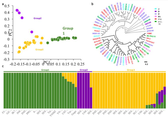 通過(guò)對(duì)64份甘蔗(Saccharum spontaneum)群體材料遺傳多樣性研究,發(fā)現(xiàn)其具有廣泛的自然部分范圍,遍及亞洲,印度次大陸,地中海和非洲,且自然種群具有廣泛的表型,遺傳和倍性水平多樣性(圖4)。研究發(fā)現(xiàn),與高粱相比具有大規(guī)模染色體重排的S. spontaneum區(qū)域具有比非重排區(qū)域更高的遺傳多樣性,并且可能經(jīng)歷了更強(qiáng)的平衡選擇。雖然幾條單獨(dú)的染色體沒(méi)有顯示出顯著差異,但是比較所有染色體上的平均值顯示重排區(qū)域中的核苷酸多樣性(0.00025±0.00003)遠(yuǎn)高于非重排區(qū)域中的核苷酸多樣性(0.00021±0.00001),染色體重排區(qū)域的Tajima’s D(-0.659±0.052)遠(yuǎn)遠(yuǎn)高于非重排區(qū)(-0.720±0.011),重排區(qū)的SNP密度(360.27±48.41) 高于非重排區(qū)域(297.46±12.65, P=0.001798);此外,GO富集顯示,染色體非重排區(qū)主要富集到與基本生命周期,光合作用,呼吸作用和ATP合成的通路上。重排區(qū)主要富集在GO生物合成和代謝,跨膜轉(zhuǎn)運(yùn)和離子結(jié)合通路上。