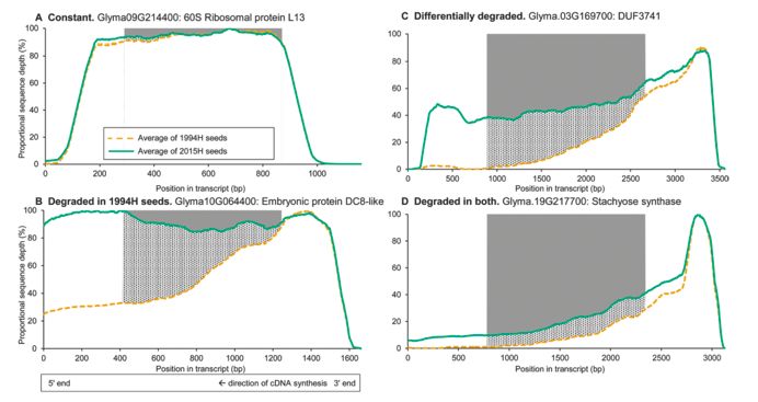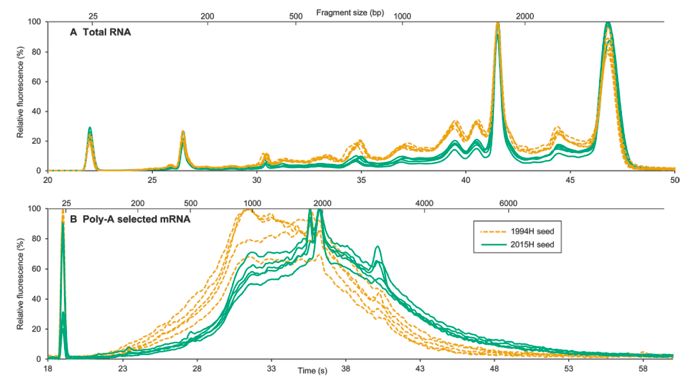 在相隔21年的種子的胚軸中比較mRNA的降解,2015H和1994H分別顯示未衰老和增加衰老癥狀。使用全分子cDNA無(wú)打斷的測(cè)序方法對(duì)RNA進(jìn)行測(cè)序。發(fā)現(xiàn)一些轉(zhuǎn)錄本在兩個(gè)群組中均有降解,但在1994H種子的組織中觀察到更多的損傷。損傷主要由于片段碎裂造成,如電泳圖譜的變化,轉(zhuǎn)錄本覆蓋長(zhǎng)度和測(cè)序深度所示。幾乎沒(méi)有證據(jù)表明轉(zhuǎn)錄本丟失或引起了氧化損傷。降解轉(zhuǎn)錄本中片段大小的連續(xù)分布以及轉(zhuǎn)錄本長(zhǎng)度和降解之間的正相關(guān)支持了通過(guò)隨機(jī)片段化造成mRNA降解的假設(shè),這與氧化事件引起死亡的假設(shè)一致。