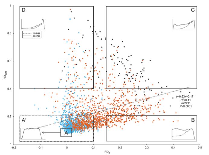 圖3. 比較2015H和1994H每個(gè)位置的轉(zhuǎn)錄本reads之間的平均歸一化測(cè)序深度